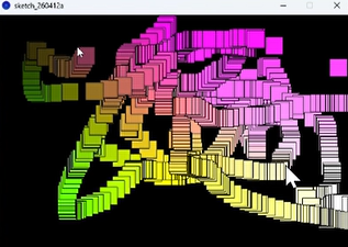 そもそもの教材では、描画色は白一色なのですが、それじゃつまらないと思ったようで「色を変えたい」と自ら提案してくれて、色を変える方法をいろいろ考えたようで、座標によって色が変わる仕様で作られていました。