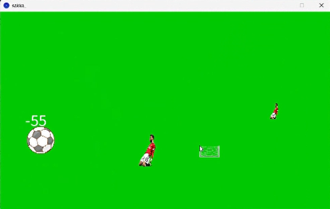 続いてはSくん。Processingでサッカーゲームを作っているとは前から聞いていて、最初は普通のPKのゲームだったと記憶していたのですが、気が付いたら、なぜかボールが降ってきて、ディフェンダーがウロウロ邪魔するのをよけながら、ゴール(見えにくいですが、画像の矢印部分)を動かして得点するという、全く新しい目線のゲームに変わっていました(笑)。確かに、毎回ああじゃないこうじゃないと納得いってなかった姿は見ていたんですけどね。こう来るとはね~。斬新なサッカーゲームでした(笑)。