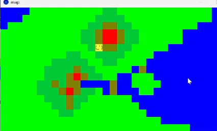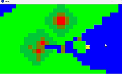 最初はHくん。Processingで作っているRPGです。基本的に細かい映像ではなくて、色分けで海・草・土などに分かれています。キーで動かす自機は黄色い真四角のブロックなのですが、よく見ていたら、自機を動かしたときにその四角に顔が現れるのです。「あれ?顔がある~!かわいいね」と声を上げてワクワクしていたら、彼が、カーソルでここを見ろとばかりにプログラムを指して、アスキーアートで作っていることが判明。上に動くと後頭部なので「( )」だけ、下に動けば前向き「( ‘_‘ )」左に動けば左向き「(_‘ )」右に動けば右向き「( ‘_)」と動きに連動して顔が付いています!素晴らしいアイデア!絵を貼るより軽そうです。 いかに軽くするかということなのか、手間を省くかということだったのか、真相は不明なんですが、授業後に担当の先生が「気が付いてくれたことがうれしかったみたいだよ」と言っていました。 そこに彼のこだわりが詰まっていたようです。
