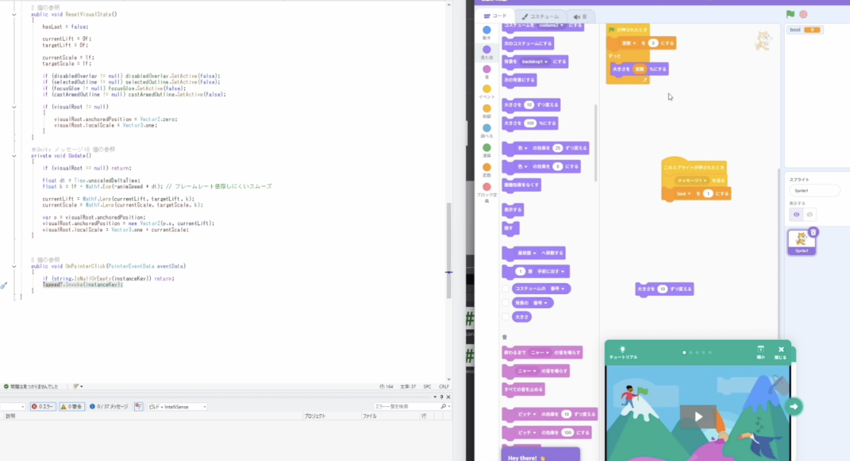 そんな彼らの呟きを拾ったKくん。なんとその場でScratchを立ち上げ、「今Unityで書いたコードをScratchのブロックで再現するとこうなるんだよ」と実演を始めてくれたのです!