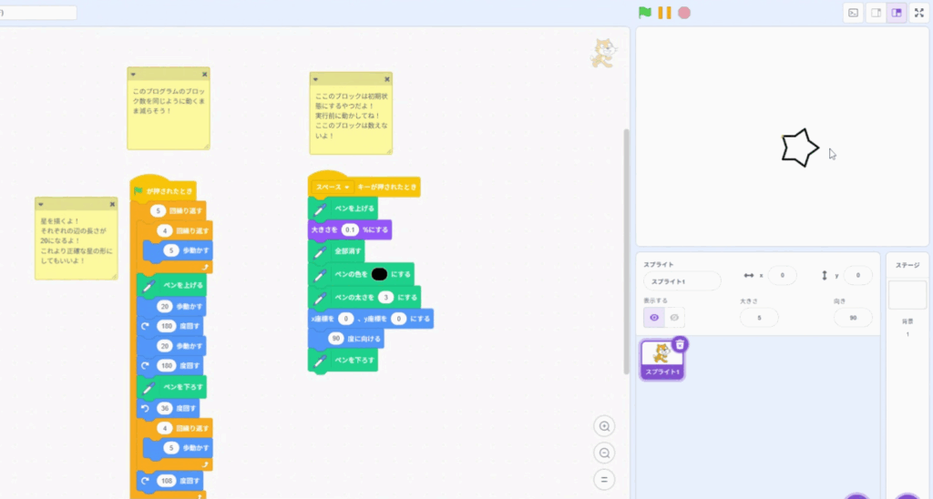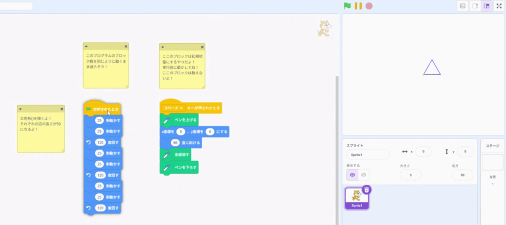 トップバッターはSくん考案のScratchで組まれたプログラムをできるだけシンプルにして、一番少ないブロック数で出来た人が優勝!という一見簡単そうに聞こえるものの、なかなか難しいお題です。
