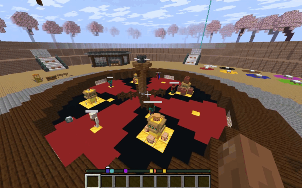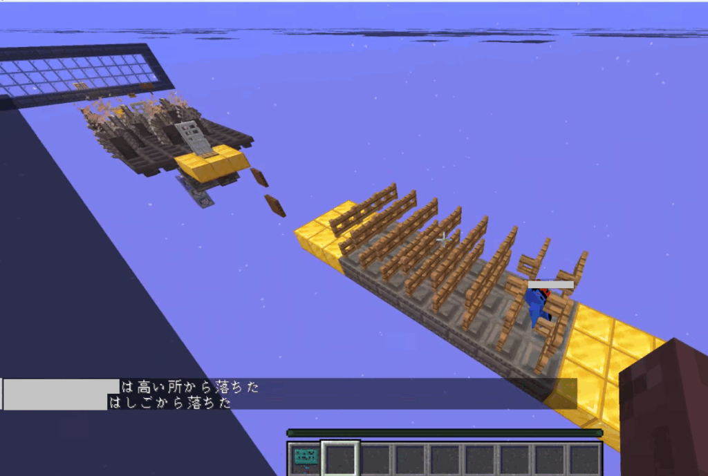 最後の出し物は、Hくん制作のマイクラで競技をするものだったのですが、java版のみだったので、出来なかった生徒さんが居たり、うまく入れず何度もトライしてやっとこ入れたりと、始まるまでに少々手間取り、なんとか始まりました。参加していない人は、参加者のうち誰が勝つか応援にまわります。先生も数人入り、ルーレット盤の上に立ってルーレットで当たったら抜けていく生き残りゲームから、空中の大玉の上での押し合いの生き残りゲームのあと、激ムズのアスレチック。推しメンが落ちると「あ~~‼がんばれ~」とワイワイ。順位でポイント加算にさらにルーレットで点数がプラスされたりマイナスされたりと、盛りだくさん過ぎて時間オーバー(笑)。さすがに生徒が上位を占めました。