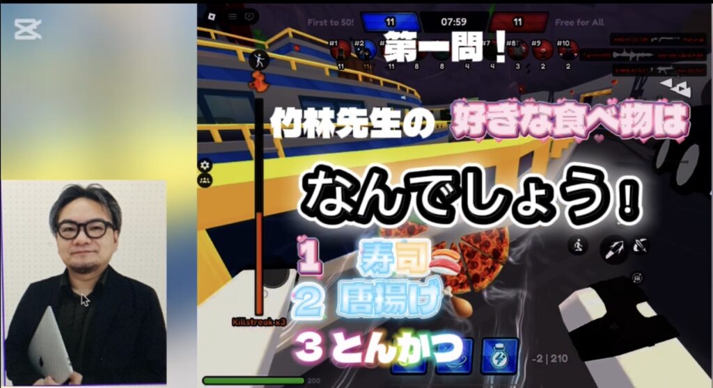 次はKくん制作の「竹林先生クイズ」です。こちらは動画で作成されています。ファンキーなカラーの街並みの中を走り回っているような映像をバックに制作者の作った問題が流れます。しかも、製作者が問題を読んで、その声を加工する手の込みよう。「竹林先生の好きな食べ物は?」などのゆるい質問が流れます。なかなかにシュール(笑)。みな、ワイワイしながら選択肢を選んでいるところに、竹林先生ご本人がかく乱するようなことを言い回り、みな翻弄されつつ答えをチャットに書き込んで、文句を言ったり笑ったりと盛り上がりました。
