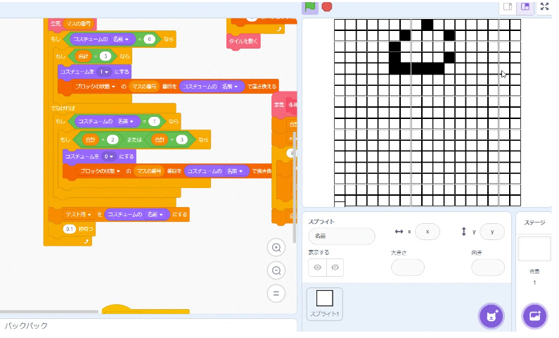 M君がScratchで「ライフゲーム」を作っていました。ライフゲームとは…詳しくは調べていただいたら良いのですが、格子状のキャンバスに描かれた「セル」が、ルールにしたがって「誕生」「生存」「死」などの状態に遷移するというものです。(実際はもっと複雑です)