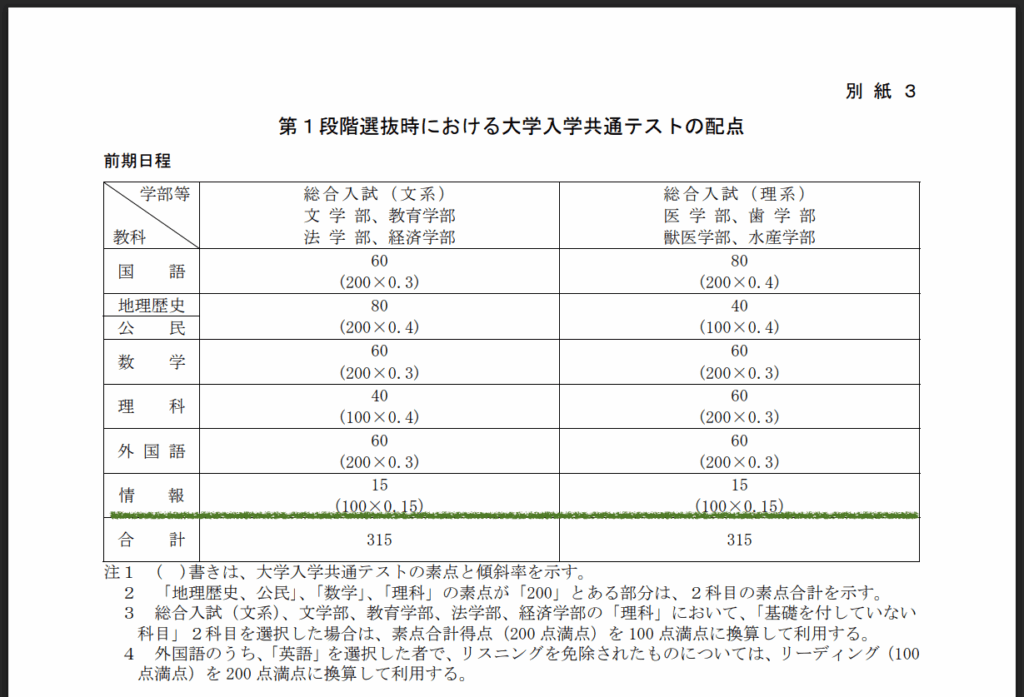 令和8年度北海道大学入学者選抜要項 を見てみました。P19にある別紙3「第1段階選抜時における大学入学共通テストの配点」をみてみると今年から15点配点されるようです。今年から”配点なし”の大学ではなくなるようです。15点ということで、合計315点のうち15点ということで5%弱(4.76%)得点となるようです。割合は大きく無いですね。