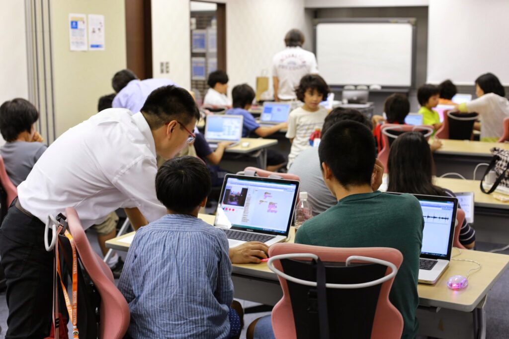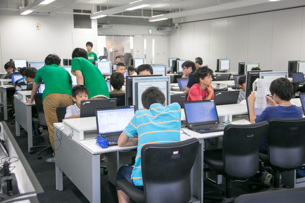 教室には小3から中学生までバラバラの年代が20人ほど、各々好きな言語で思い思いの作品を作っていました。まさに、寺子屋方式。数人の先生がぐるぐる回って「どう、できた?」とか「どこがわからない?」と見て回っています。我が家は体験なのでほぼ付きっきりで見てもらっていましたが、それでもちょこちょこ「先生これわかんない」とか、「先生見て見て!できたよ!」と気軽に生徒が声をかけてきます。